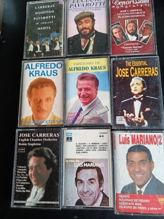 Vendo 9 casetes de música clásica en buen estado. Incluyen a grandes artistas como José Carreras, Plácido Domingo, Luciano Pavarotti y Alfredo Kraus. - Algunos títulos incluyen: 'Carreras Domingo Pavarotti', 'Luciano Pavarotti', 'Cenorissimi Mondiale', 'Alfredo Kraus', 'Canciones de Alfredo Kraus', 'The Essential José Carreras', 'José Carreras' y 'Luis Mariano'. - Perfectos para coleccionistas.