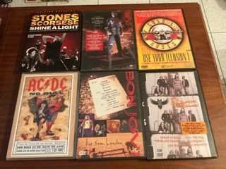 Se venden seis DVDs de conciertos de rock en buen estado. - Incluyen Shine a Light (Stones), Greatest Hits (Michael Jackson), Use Your Illusion I (Guns N' Roses), No Bull (AC/DC), Live from London (Bon Jovi), y The Black Crowes Live. - Son una colección ideal para amantes del rock. Todos los DVDs están impecables. Hago envíos pero no por Wallapop envíos.