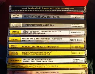 Lote de 11 CDs DG de Mozart: - Mozart: Die Zauberflöte BPO Karajan digital 3CD sin libreto - Mozart Requiem BPO Karajan - Mozart: Eine Kleine Nachtmusik / Divertimenti BPO Karajan - Mozart: Così fan tutte - Highlights WPO Levine - Mozart: Symphonien Nr. 25, 26, 27 WPO Levine - Mozart: Eine Kleine Nachtmusik / Serenata Notturna BPO Bohm - Mozart - Symphonies 35,36,38, 40,41 BPO Bohm 2CD -Mozart Symphonies 25,35,40 WPO Bernstein