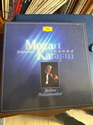 Conjunto de tres vinilos de las Sinfonías de Mozart dirigidas por Karajan. - Sinfonías 32, 35, 36, 38, 39, 40 y 41. - Grabación de Deutsche Grammophon (DG). - Interpretación de la Filarmónica de Berlín. - Incluye libro con historia.