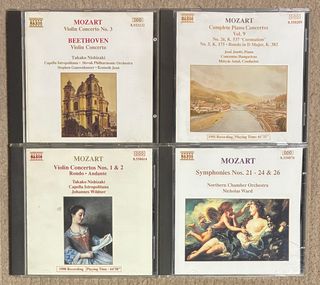 Conjunto de 30 CD de música clásica de Mozart. Incluye una amplia variedad de sus obras. - La Flauta Mágica (I y II) - Così fan tutte (I y II) - Don Giovanni (I y II) - Las Bodas de Fígaro (I y II) - Sinfonías (I y II) - Conciertos para piano (I y II) - Conciertos para violín - Conciertos para trompa y orquesta - Sonatas para piano - Sonatas para violín y piano - Arias de concierto - Música masónica - Gran Misa y otras obras sacras - Quintetos de cuerda - Obras para flauta - Cuartetos de cuerda - Serenatas - Requiem - Música para instrumentos de viento - Mozart Niño