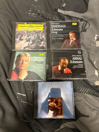 Lote de cinco CDs de música clásica. - Johann y Josef Strauss - Zimmermann: Schumann, Grieg - Karajan: Mozart - Arrau: Schumann - Joaquín Rodrigo, Paco de Lucía Pequeña mancha de estar guardado por la parte de atrás.