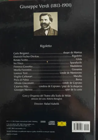 Doble CD de la ópera Rigoletto de Verdi, editado por Deutsche Grammophon. - Incluye las interpretaciones de Bergonzi, Fischer-Dieskau, Scotto, Cossotto y Vinco. - Coro y Orquesta del Teatro alla Scala de Milán. - Dirección de Rafael Kubelik. - Grabación digital.