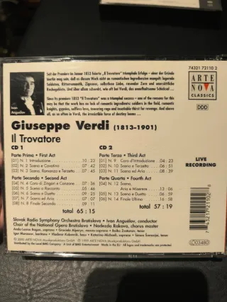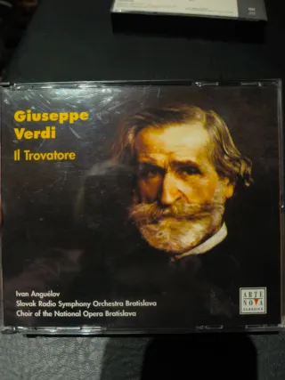 Caja con 2 CDs de la ópera Il Trovatore de Giuseppe Verdi. Dirigida por Ivan Anguélov con la Slovak Radio Symphony Orchestra Bratislava y el Choir of the National Opera Bratislava. - Sello discográfico Arte Nova Classics, del 2000.