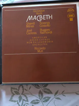 Grabación de la ópera Macbeth de Giuseppe Verdi. La caja contiene 3 LPs y el folleto con libreto completo. - Intérpretes: Sherrill Milnes, Fiorenza Cossotto, José Carreras, Ruggero Raimondi. - Orquesta: Ambrosian Opera Chorus, New Philharmonia Orchestra. - Director: Riccardo Muti. - Sello discográfico: EMI/Supraphon, editado 1976