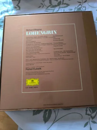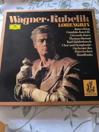 Grabación de la ópera Lohengrin de Wagner, dirigida por Rafael Kubelík. - Intérpretes: James King, Gundula Janowitz, Gwyneth Jones, Thomas Stewart, Karl Ridderbusch. - Coro y Orquesta Sinfónica de la Radio de Baviera. - Sello Deutsche Grammophon/ Orphée d'Or. La caja contiene 5 LPs y un folleto con comentarios y libreto completo en inglés, francés y alemán.