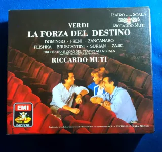 Cofre de la ópera La Forza del Destino de Verdi. - Incluye 3 CDs y libreto, - Grabación de Teatro alla Scala con Riccardo Muti. - Intérpretes: Domingo, Freni, Zancanaro, Plishka, Brusca, Surian, Zajic. - Orquesta y Coro del Teatro alla Scala.