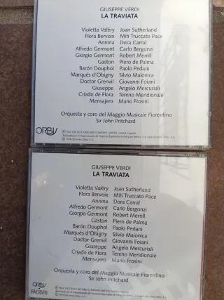 Dos CDs de la ópera La Traviata de Giuseppe Verdi, parte de la colección Opera Collection. - Incluye la primera y segunda parte de la ópera. - Intérpretes: Sutherland, Bergonzi, Merrill. - Orquesta y coro del Maggio Musicale Fiorentino. - Dirección: Sir John Pritchard.