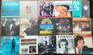 Lote de vinilos variados en formato single, incluyendo flamenco, pop nacional y romántico, rock progresivo y otros. Golpes Bajos, Alaska y los Pegamoides, Albano y Romina Power, Ariel Rot, Ana Belén, Alfonso Pahino, Azabache, Barón Rojo, Claudio Baglioni, Cómplices, Danza Invisible, Dyango, Fernando Fernan Gómez, Imán Califato Independiente, Ipso Facto, Ismael, Jarcha, Jose Velez. Uno por 15 €, dos por 25 €. Mayor cantidad, más descuento, lo hablamos.