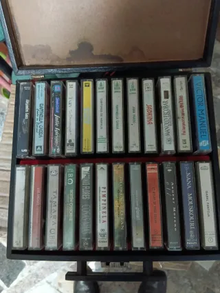 Maletín de transporte para cassettes de música, con una colección de 30 cintas. - Incluye artistas como Luis Miguel, Tamara, Bertín Osborne, Pimpinela, Gloria Estefan, Nana Mouskouri, Isabel Pantoja, Victor Manuel, Raffaella Carra, Sabrina, entre otros. - Géneros variados: pop, rock, latino, romántico.