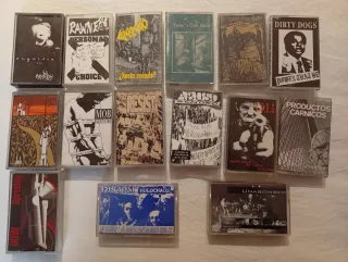 Lote de 15 cintas de cassette con música punk y hard rock. Incluye títulos como Rawne, Mob, Disarm Holochaos, Unabomber, Dirty Dogs, Productos Carnicos, Uprising y Abuso Sonoro. - 15 cintas de cassette. - Géneros: Punk, Hard Rock.