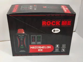 Pack de 5 dispositivos Rock Me sabor Watermelon Ice. - Modo NORM y TURBO. - 25000 caladas. - Mega pantalla. - Doble resistencia de malla. - Flujo de aire ajustable. - Botón de calada.