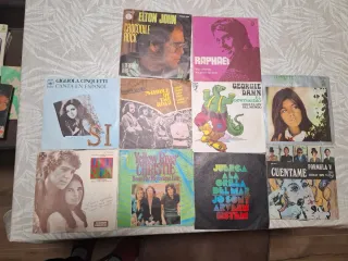 Lote de 10 discos de vinilo de los años 70, con éxitos de pop y rock internacional. - Elton John - Crocodile Rock - Raphael - Tu volverás - Gigliola Cinquetti - Canta en español - Middle of the Road - Chirpy Chirpy Cheep Cheep - Georgie Dann - El Dinosaurio - Jeanette - Soy Rebelde - Formula V - Cuentame - Yellow River - Down The Mississippi Line - Juerga a la orilla del mar - Disco de pareja desconocido
