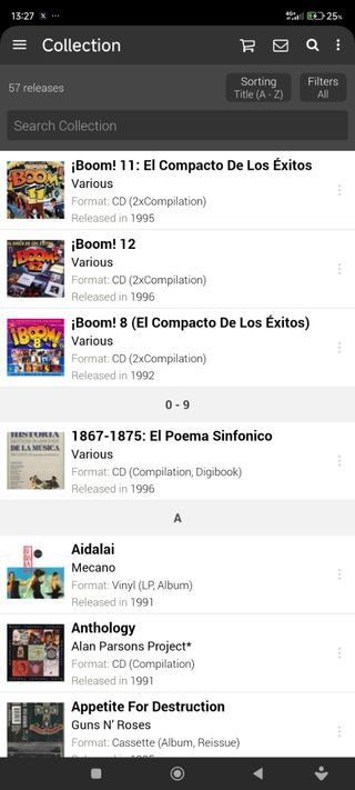Colección de CDs de música y algún cassette originales y en buen estado (puedo mandar fotos del que os interese). Muchos ni se han usado. Sobre todo hay BSO (El nombre de la rosa, pulp fiction, Warsaw to Hollywood de W. Kilar...), rock (Scorpions Gold Ballads, Guns N'Roses Appetite for destruction, Bon Jovi This left feels right, Roxette, aerosmith), 10 recopilatorios BOOM, recopilatorios dance (Máquina del tiempo 2, Lo más disco 3)... Entre otros. A partir de 2 euros CD simple y 3 euros CD doble. También hay algún cassette. No envío a no ser que pase de los 20€. Gracias