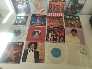 Colección de vinilos de 7 pulgadas en buen estado. La colección incluye varios artistas populares de los 80s. - Algunos vinilos son de Queen, Bon Jovi, Michael Jackson y Scorpions. - Se incluyen varios sencillos de artistas icónicos. - Perfectos para coleccionistas o amantes de la música de los 80s.