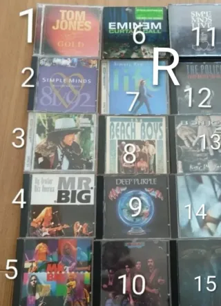 1 / Tom Jones - Gold: 3€ 2 / Simple Minds - 81/92: 3 € 3 / Bob Dylan - Desire: 3€ 4 / Mr. Big - Hits: 3€ 5 /Mr.BigJapandemonium:n3€ 6 / Eminem(2u)Curtain Call: 3€ 7 / Simply Red - Life: 3€ 8 / The Beach Boys: 3€ 9 / Deep Purple - Masters: 3€ 10 / Eagles - Desperado: 3€ 11 / Simple Minds (2u) Live: 3€ 12 / The Police - Single 3€ 13 / Bon Jovi-Krep the Fait 3€ 14 / Bon Jovi - New Jersey: 3€ 15 / Eagles OneTheseNights3€