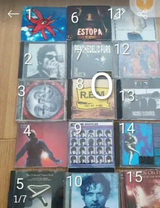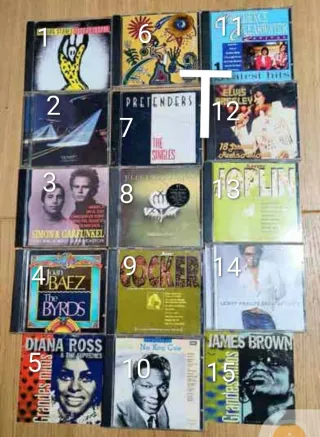 1* T'he cure 3€ 2* Bob Dylan 3€ 3* Sazón 3€ 4* Sumple Read 3€ 5* Mike Oldfield: 3€ 6* Estopa 3€ 7* Psicodèlic Furs 3€ 8* Rem 3€ 9* T'he Beatles 3€ 10*Symply Red 3€ 11* Lenny Kravix 3€ 12*Santana3€ 13*U-2 3€ 14* Four Roses 3€ 15* Queen 3€