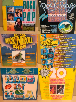 Colección de 6 vinilos LP con recopilatorios de rock y pop. - Rock and Pop Classics - Rock 'n' Roll Show - Hit Explosion Vol. 3 - Rock 'n' Roll Non Stop - Made in USA - 20 Original Chart Hits