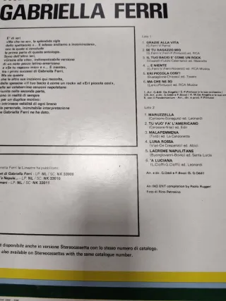 Disco de vinilo de Gabriella Ferri. - Título: Cose di Ieri, dell'altro Ieri e di Sempre. - Canciones incluidas: Grazie alla vita, Se tu ragazzo mio, Il tuo bacio è come un rock, E niente, Eri piccola cosí!, Ma che ne so, Maruzzella, Tu vuò fa l'americano, Malafemmena, Luna rossa, Lacreme napulitane, 'A luciana.