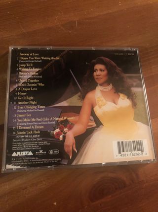 CD Greatest Hits (1980–1994) de Aretha Franklin, publicado por Arista en 1994. Recopila su etapa pop-soul y R&B con colaboraciones destacadas: George Michael ( I Knew You Were Waiting (For Me) ), Luther Vandross ( Doctor’s Orders ), Michael McDonald ( Ever Changing Times ) y Bonnie Raitt junto a Gloria Estefan ( You Make Me Feel (Like a Natural Woman) ). Producción ejecutiva de Clive Davis. Aviso incluido en portada: STOP!, que esto engancha.