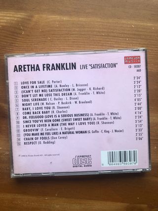 CD Aretha Franklin – Live “Satisfaction” . Edición de 1996 por Promo Sound AG (sello La Mejor Música). Recoge actuaciones en directo con clásicos del soul y R&B como Respect , Dr. Feelgood (Love Is a Serious Business) o Chain of Fools . Incluye también su versión de (I Can’t Get No) Satisfaction de los Rolling Stones, porque cuando Aretha canta, hasta Jagger asiente. Show en vivo con repertorio potente y la voz en plena forma. Soul con mayúsculas.