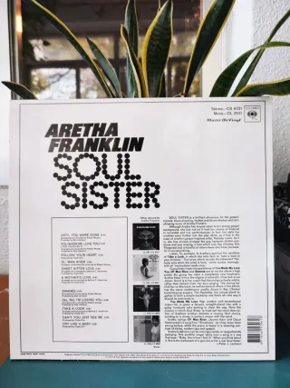 Disco de vinilo de Aretha Franklin, álbum Soul Sister. - Género: R&B y Soul. - Canciones incluidas: Until You Were Gone, You Made Me Love You, Swanee, Sweet Bitter Love, Cry Like A Baby, Follow Your Heart, A Mother's Love, (No, No) I'm Losing You, Take A Look, Can't You Just See Me, Ol' Man River.