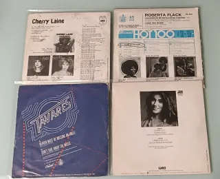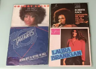 Lote de 4 singles de vinilo de 7 pulgadas con éxitos internacionales. - Cherry Laine - Hi-Ho (The Sea-Fare Folk) - Roberta Flack - Suavemente Me Mata Con Su Canción - Tavares - Heaven Must Be Missing An Angel - Laura Branigan - Gloria