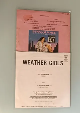 Lote de dos singles de vinilo de 7 pulgadas. - On the Radio de Donna Summer. - It's Raining Men de The Weather Girls.