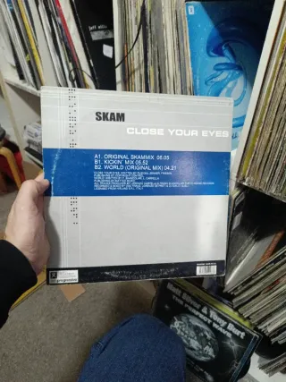 Vinilo del sello Skam, título Close Your Eyes. - Portada con diseño gráfico en azul y blanco. - Incluye firma en la portada.