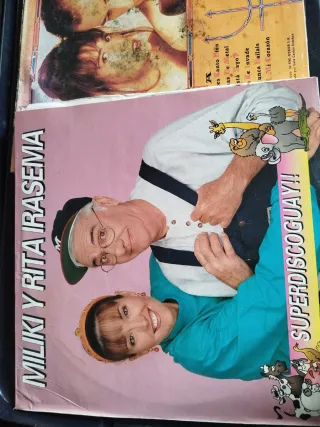 Colección de discos de vinilo antiguos con portadas ilustradas. Incluye varios géneros musicales. Lote de 40 Ciscos - Portadas con diseños vintage. - Discos de música variada.