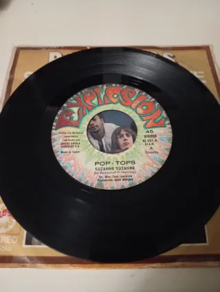 Disco de vinilo de 7"del grupo Pop Tops firmado por los siete miembros de la banda - Título: Happiness Ville. - Incluye las canciones Suzanne Suzanne. - Sello: Explosion Records. - Referencia: 103510.