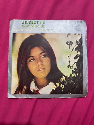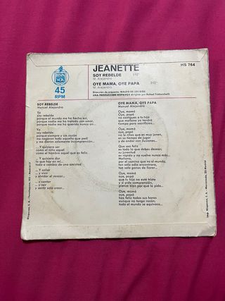 Single de vinilo de Jeanette con la canción Soy Rebelde. - Título: Soy Rebelde - Artista: Jeanette - Cara B: Oye mamá, oye papá - Sello discográfico: Hispavox - Referencia: HS 764