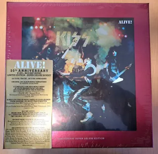 KISS – 'Alive! 50th Anniversary Super Deluxe Edition" Boxset edición limitada de coleccionista del álbum ALIVE! de KISS. - 8 Vinilos + Blu-ray Audio. - 120 temas en total, 88 de ellos sin publicar. - Incluye el álbum original de 1975 remasterizado. - Dos conciertos completos mezclados por Eddie Kramer. - Pistas de audio Blu-ray con mezclas Dolby Atmos y 5.1. - Libro de tapa dura de 100 páginas con entrevistas y notas históricas. - Artículos exclusivos de coleccionista. - Camiseta exclusiva talla M. - Totalmente nuevo, precintado y en su embalaje original. *NO DISPONIBLE en tiendas, solo en la Web del grupo*