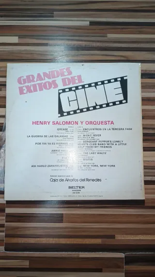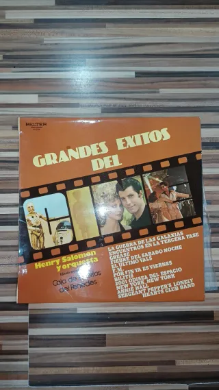 Disco de vinilo Grandes Éxitos del Cine interpretado por Henry Salomón y su orquesta. - Incluye La Guerra de las Galaxias. - Contiene Encuentros en la Tercera Fase. - Incluye Grease. - Fiebre del Sábado Noche está presente. - El Último Vals es una de las pistas. - Por fin ya es viernes forma parte del repertorio. - 2001 Odisea del Espacio se incluye. - New York, New York es una de las canciones. - Sergeant Pepper's Lonely Hearts Club Band está en el disco.