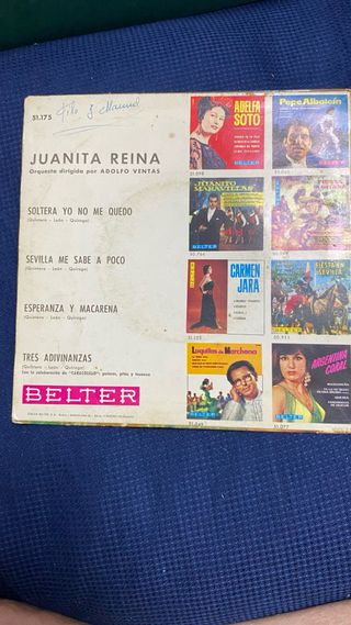 Vinilo single de Juanita Reina. - Título: Soltera Yo No Me Quedo - Cara B: Sevilla Me Sabe A Poco, Esperanza Y Macarena, Tres Adivinanzas - Sello: Belter - Referencia: 51.175