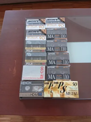 Lote de cintas de casete de metal de varias marcas reconocidas. - SONY METALLIC 90 (3 unidades) - TDK MA 110 (5 unidades) - FUJI METAL TAPE 60 (2 unidades) - NAKAMICHI SX-C90 - DENON HD-M 75 - AXIA PS METAL 50 MADE IN Japan todas. Las Sony con desperfectos de precinto. Super precio