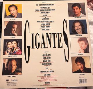 Disco de vinilo recopilatorio Gigantes. - Incluye temas de El Puma, Julio Iglesias, Luz Casal, J. L. Perales, R. Carlos, R. Durcal, R. Jurado, P. Domingo, P. San Basilio y J. Pardo. - Canciones como Torero, Piensa en mí, América, Si piensas... si quieres..., Sevilla, Bésame mucho/Solamente una vez y Amigos.