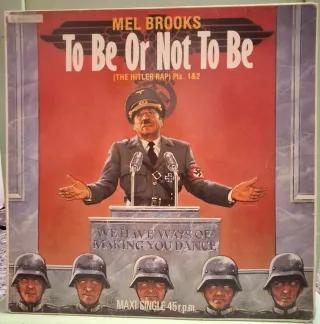 Vinilo de Mel Brooks con la canción To Be Or Not To Be (The Hitler Rap) Pts. 1 & 2. KKO, SPACIO, KIUS, PONT AERI, METRO, COLISEUM, LOTE REMEMBER, CENTRAL ROCK, LIMITE, SKANDALO, ACTV, SPOOK, APTC, HOOK, NOD, FACTORY, KARAMELO, CHASIS, SCORPIA, ZENTRAL, ROCKOLA, FANTASY, VIRTUAL, MANSION - Formato Maxi Single 45 r.p.m. - Portada con ilustración de Mel Brooks como Hitler.