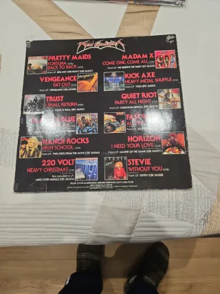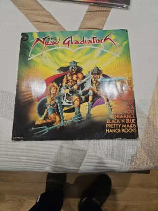 Vinilo de heavy metal The New Gladiator. - Portada con ilustración de gladiadores. - Incluye temas como Trust, Kiss, 220 Volt, Vengeance, Black 'n Blue, Pretty Maids y Hanoi Rocks.