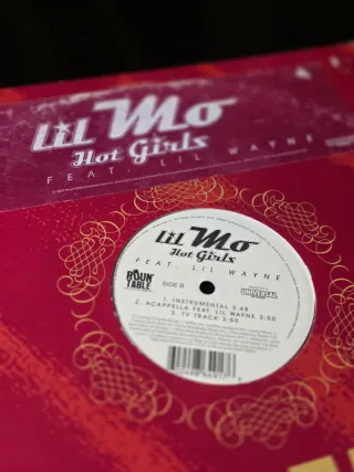 Vinilo de 12 pulgadas del sencillo Hot Girls de Lil Mo, con la colaboración de Lil Wayne. - Sencillo de Lil Mo. - Colaboración de Lil Wayne. - Cara B con Instrumental, Acappella y TV Track.