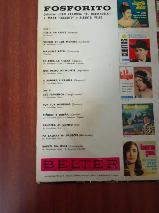 Disco de vinilo del cantaor Fosforito. Incluye canciones como En la pared y Pastora divina. - En la pared - Pastora divina - Ya no te quiero - Dejar de amarte - Cuando yo me muera - Parezco otro hombre - A Cádiz novia del sur - Plazuela del mentidero - Rabiando estoy por verte - Campanitas de oro y plata - Lo que yo estoy padeciendo - No siento que esté la fragua - Sello Belter