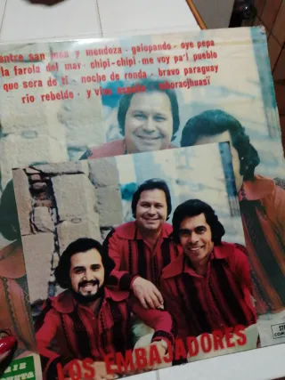 Disco de vinilo del grupo Los Embajadores. Contiene canciones como Entre San Juan y Mendoza, La Farola del Mar y Rio Rebelde. - Entre San Juan y Mendoza - Galopando - Oye Pepa - La Farola del Mar - Chipi-chipi - Me voy pa'l Pueblo - Que Sera de Ti - Noche de Ronda - Bravo Paraguay - Rio Rebelde - Y Vive España - Mboracjhuasi