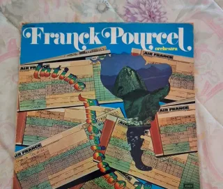 Disco de vinilo de Franck Pourcel Orchestra. - Portada con diseño inspirado en billetes de avión. - Título Latino destacado en la portada.
