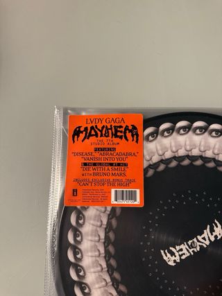 Edición especial en vinilo picture disc del álbum Mayhem de Lady Gaga. Este formato presenta un diseño único con imágenes. - Incluye las canciones Disease, Abracadabra, Vanish Into You, Die With A Smile (con Bruno Mars) y el bonus track Can't Stop The High. - Formato Picture Disc. - Sin ningún uso