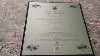 Edición especial de Héroes del Silencio en formato caja de lujo. - Caja de terciopelo. - Incluye 7 vinilos originales en ediciones facsímil. - Contiene Maxi Héroe de Leyenda, El Mar No Cesa, Siniestro Total, Senderos de Traición, Sendero, El Espíritu del Vino y Avalancha. - Incluye un póster exclusivo y un libro con material gráfico inédito.