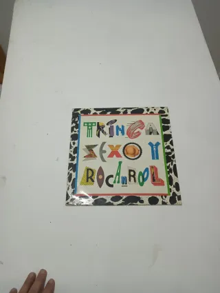 Disco de vinilo del grupo La Trinca. - Portada con diseño colorido y tipografía variada. - Borde de la portada con estampado de vaca y detalles rojos.