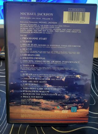 DVD de Michael Jackson History on Film Volume II. En buen estado, es un dvd de dos caras, funcionando perfectamente como se ve en las imágenes. Wallapop envíos solo esta disponible en Canarias entre islas, si eres de aquí dímelo y lo activo, para los de península se puede enviar sin problemas mediante correos y pago por bizum. - Incluye Blood on the Dance Floor (Remix). - Scream (Video del Año 1995). - Earth Song. - You Are Not Alone. - They Don't Care About Us. - Y mucho más.