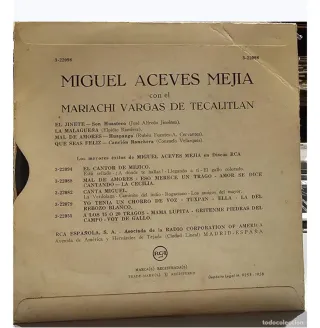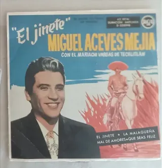 Disco de vinilo Maxi single "El Jinete" de Miguel Aceves Mejía con el Mariachi Vargas de Tecalitlán. De 1953 - Incluye las canciones El Jinete, La Malagueña, Mal de Amores y Que Seas Feliz. - Grabación de RCA.