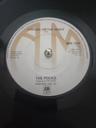 Single de vinilo Walking on the Moon de The Police. - Cara A: Walking on the Moon. - Cara B: Visions of the Night - Producido por The Police y Nigel Gray. - Publicado por Virgin Music (Pub.) Ltd. - Sello discográfico A&M Records. - Año de publicación: 1979. - Referencia: AMS 7494.