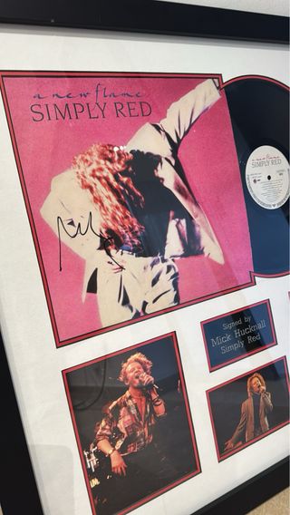 Authentic Simply Red signed display featuring the album “A New Flame”. This framed collector’s piece includes: • Original Simply Red – A New Flame vinyl record • Album cover artwork • Hand-signed autograph by Mick Hucknall • Additional band photographs • Professional framed presentation A perfect item for Simply Red fans, music memorabilia collectors, or vintage music décor. 🖼 Condition: Very good – well preserved, frame in good condition. The item shows minor wear consistent with age, mainly small marks caused by the frame. This does not affect the vinyl, artwork, or autograph and is only noticeable upon close inspection. 📏